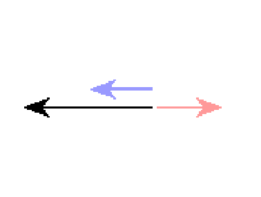 The force diagram of two opposing forces is represented by the black and red arrows. The resulting force is represented by the blue arrow. Since the two forces are acting in opposite directions, the net force is in the direction of the largest force and its magnitude is the difference between the individual forces.