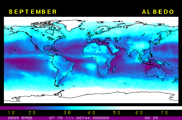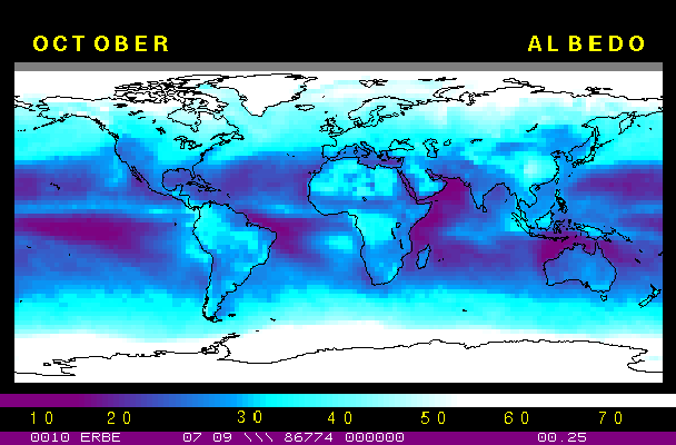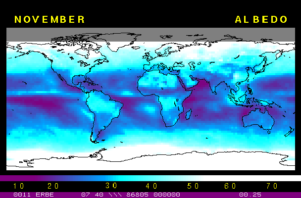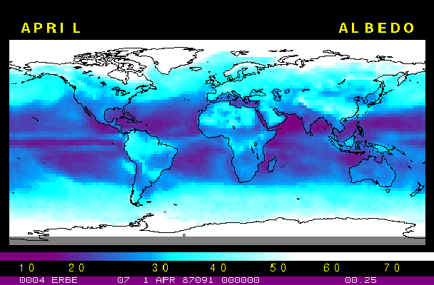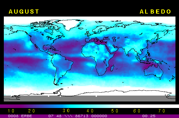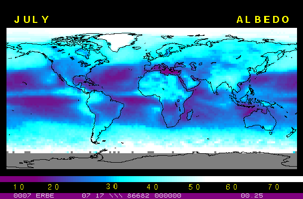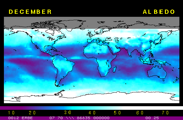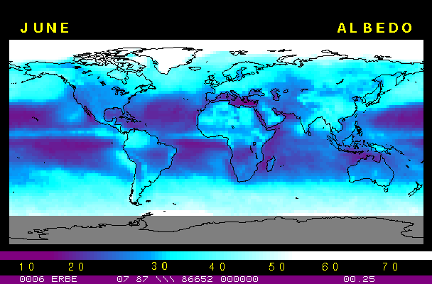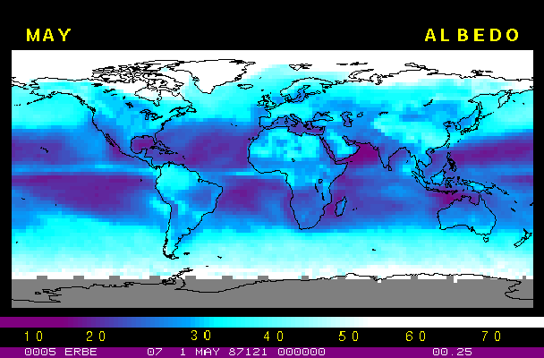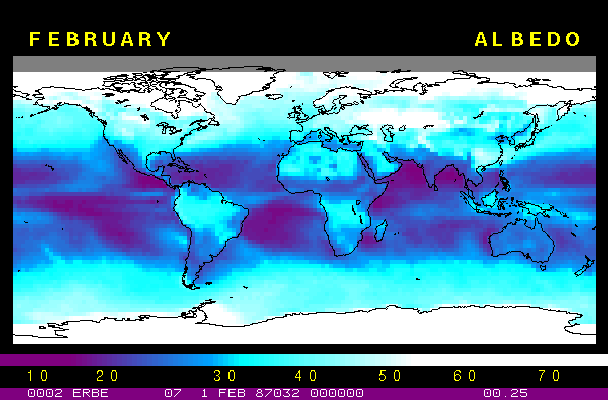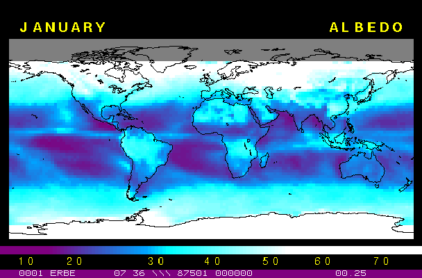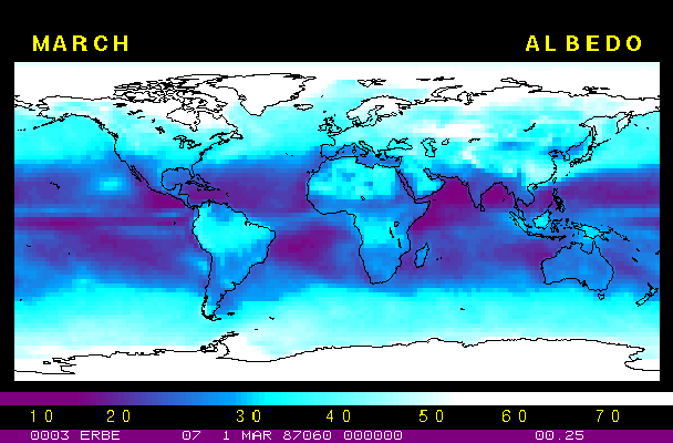 The planetary averaged albedo is a key climate variable as it, combined with the solar constant determines the radiative energy input to the planet. The global annual averaged albedo is approximately 0.30 (or 30%). The albedo varies quite markedly with geographic region and time of year. Oceans have a low albedo, snow a high albedo. While the Northern Hemisphere has more land the Southern Hemisphere, the annual average albedo of the two hemispheres is nearly the same, demonstrating the important influence of clouds in determining the albedo. You can view a loop of the monthly mean planetary albedo or view each month individually. Some of the many interesting features in these maps are described below. You can also directly access this data for your investigations. Annual Loop of Monthly Mean AlbedoNotice the high albedo off the west coast of South America. This is a region of persistent low level clouds -- stratus clouds. Can you find other regions of oceanic stratus? Can you explain why Greenland has a very high albedo compared to its surroundings? Notice the strong dependence of albedo on season, the annual cycle of the albedo follows the annual cycle of the position of the sun. Also notice that cloud free ocean regions have low albedos while deserts generally have high albedos. In the tropical regions the albedo variation is influenced primarily by weather disturbances and their associated cloud distributions. In the polar regions, seasonal variations in albedo are due to the distribution of major ice sheets and the decreasing mean solar elevation angle with latitude. |