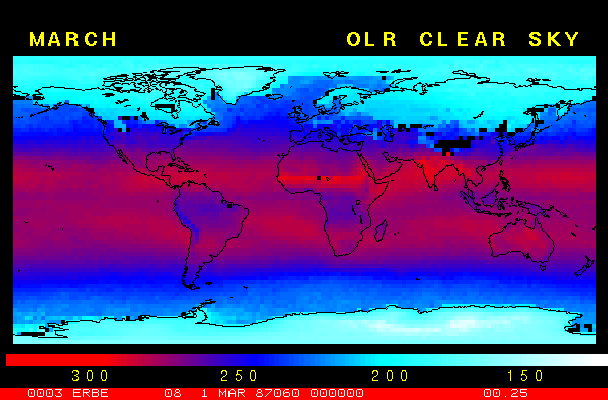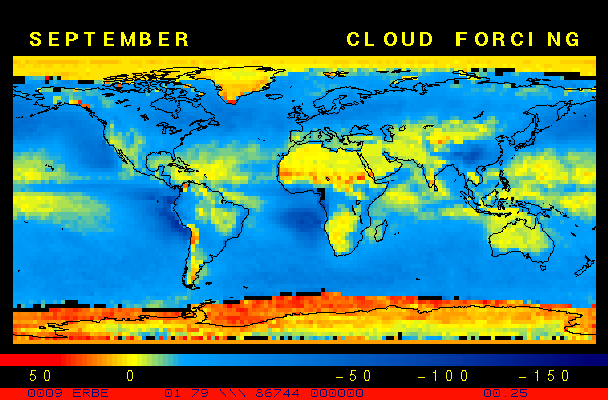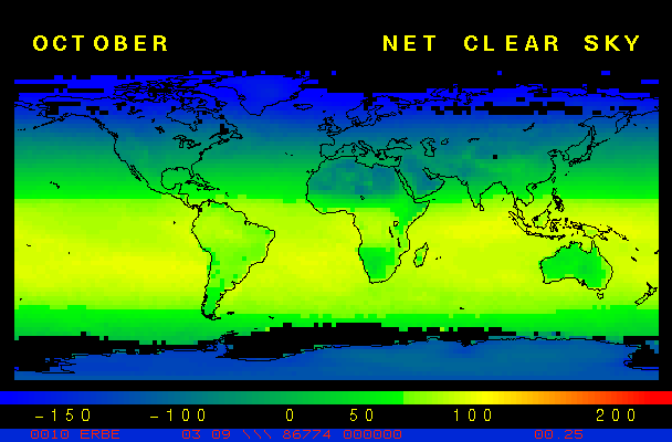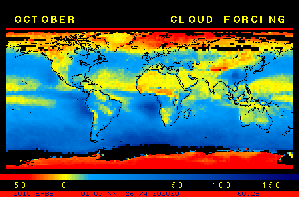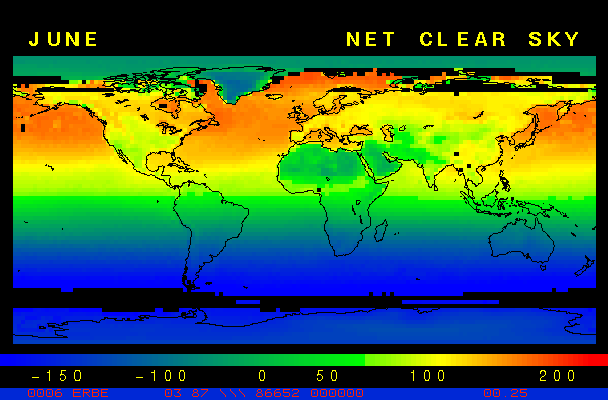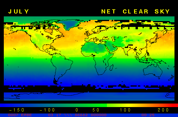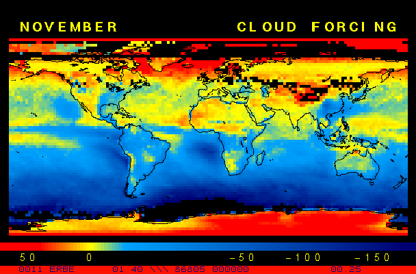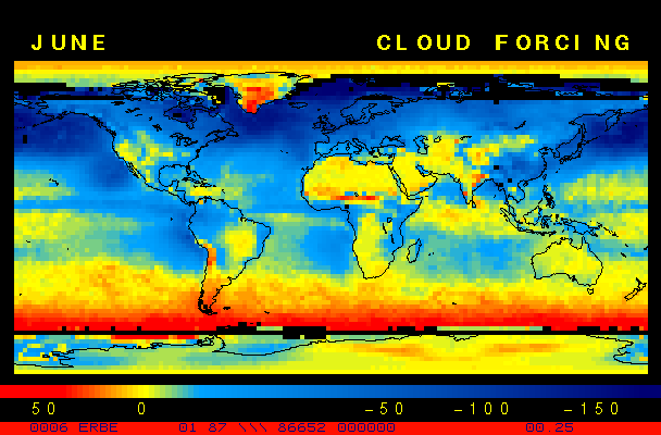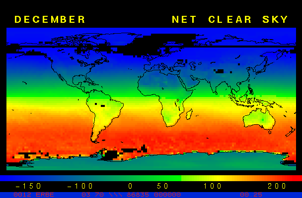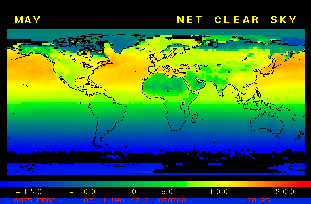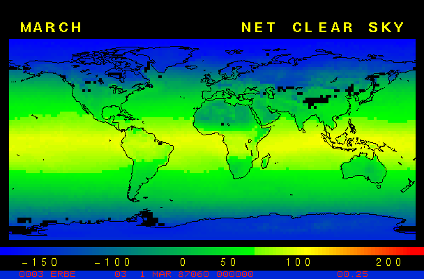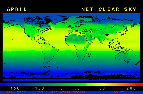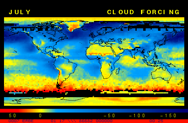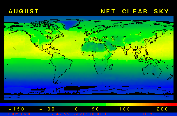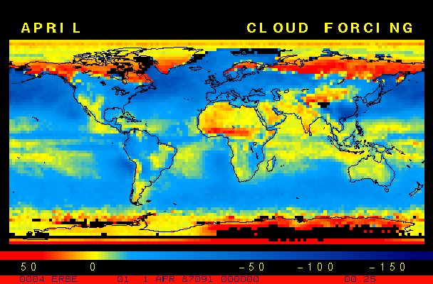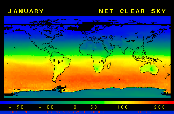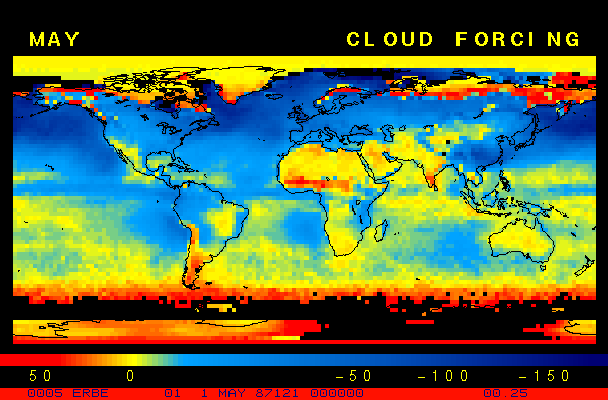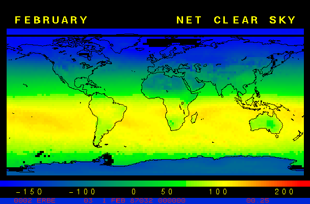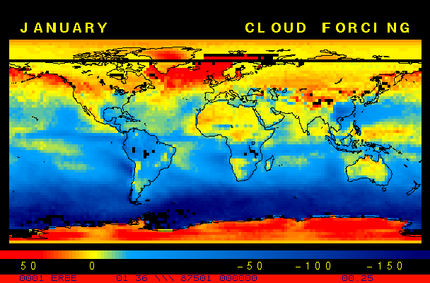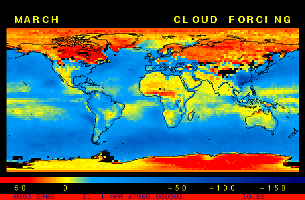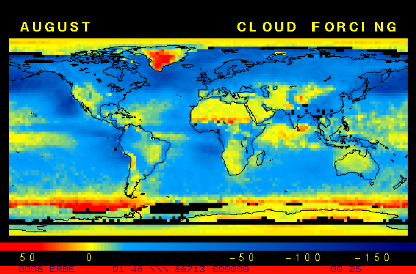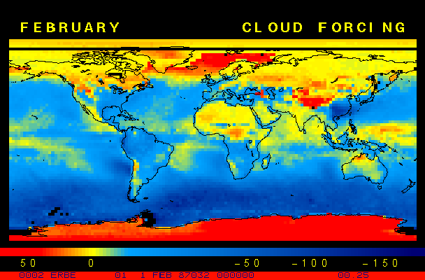 Clear-sky observationsBelow are the ERBE derived monthly mean clear-sky albedo, outgoing longwave radiation, and net radiation budgets. From these maps you can observe the effects of changing vegetation on the energy balance of the planet. Observations of cloud radiative forcing are given below.Loop of Monthly Mean Clear-sky Albedo Loop of Monthly Mean Clear-sky OLR Loop of Monthly Mean Clear-sky Net RadiationCloud radiative forcingThe solar and terrestrial properties of clouds have offsetting effects in terms of the energy balance of the planet. In the longwave, clouds generally reduce the radiation emission to space and thus result in a heating of the planet. While in the solar (or shortwave), clouds reduce the absorbed solar radiation, due to a generally higher albedo than the underlying surface, and thus result in a cooling of the planet. The latest results from ERBE indicate that in the global mean, clouds reduce the radiative heating of the planet. This cooling is a function of season and ranges from approximately -13 to -21 Wm-2. While these values may seem small, they should be compared with the 4 Wm-2 heating predicted by a doubling of atmospheric concentration of carbon dioxide. In terms of hemispheric averages, the longwave and shortwave cloud forcing tend to balance each other in the winter hemisphere. In the summer hemisphere, the negative shortwave cloud forcing dominates the positive longwave cloud forcing, and the clouds result in a cooling. View the maps of cloud forcing given below to answer the following questions: