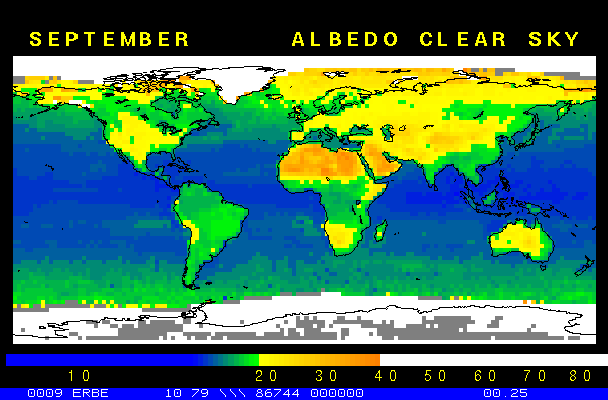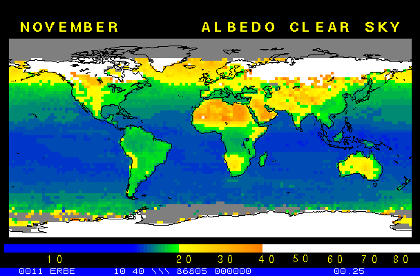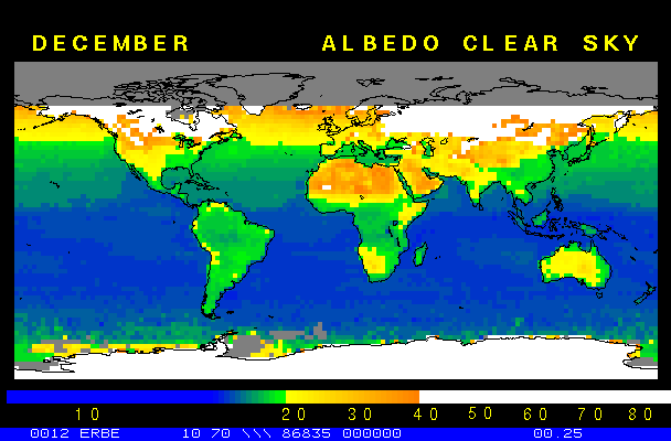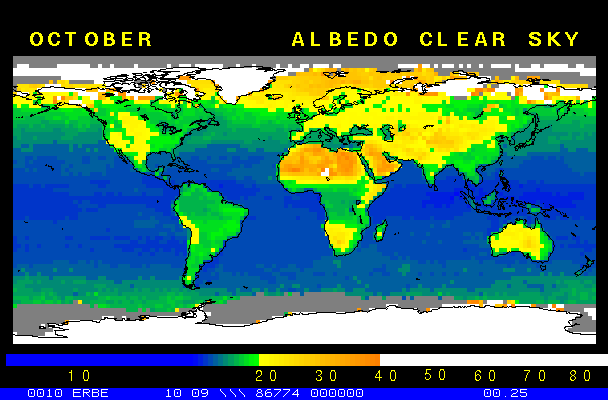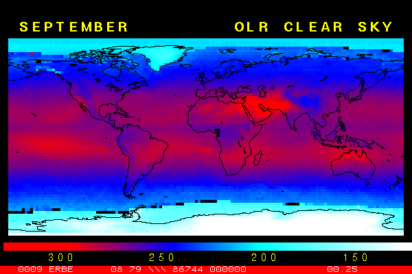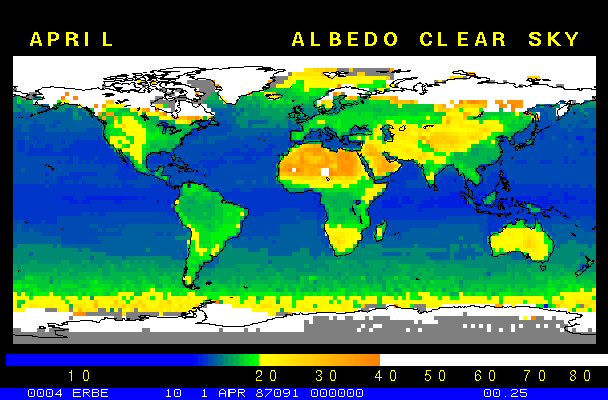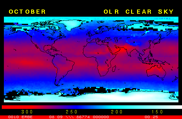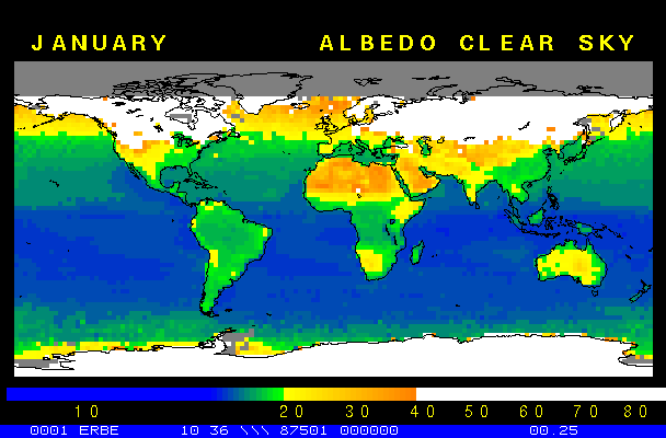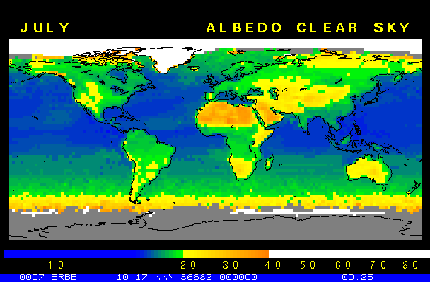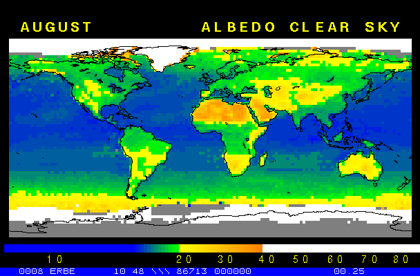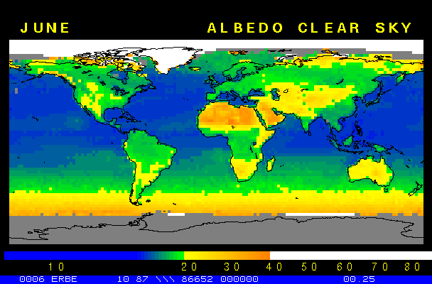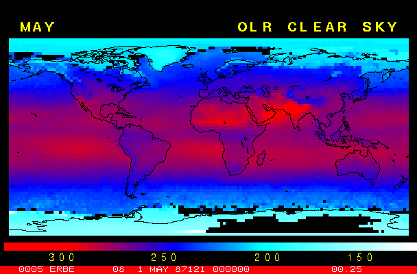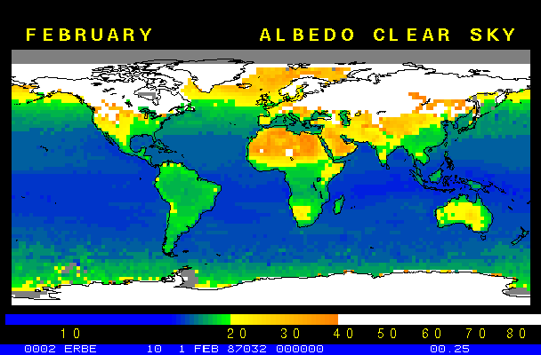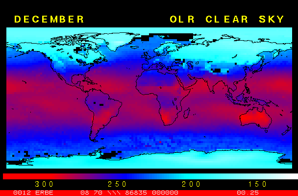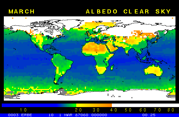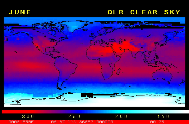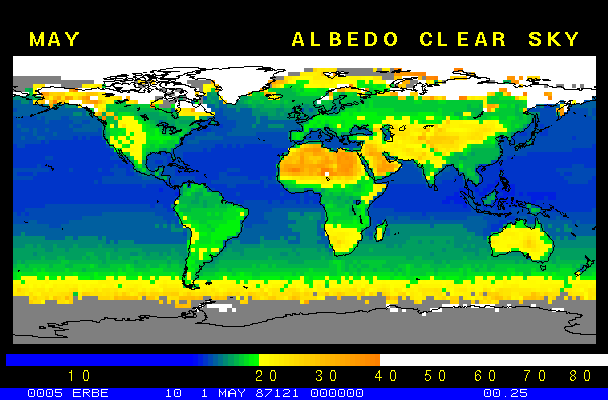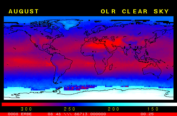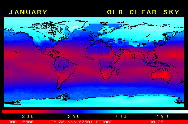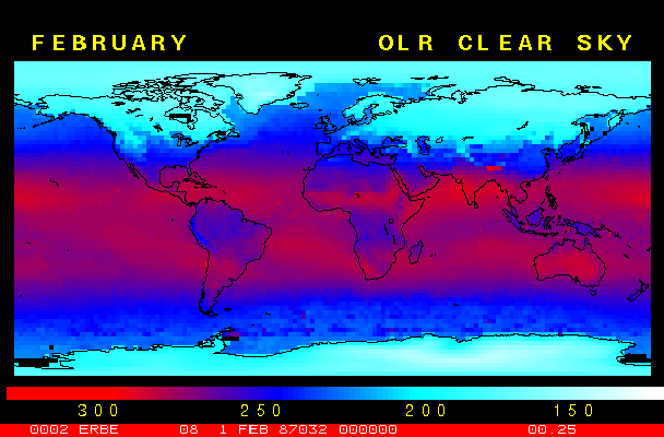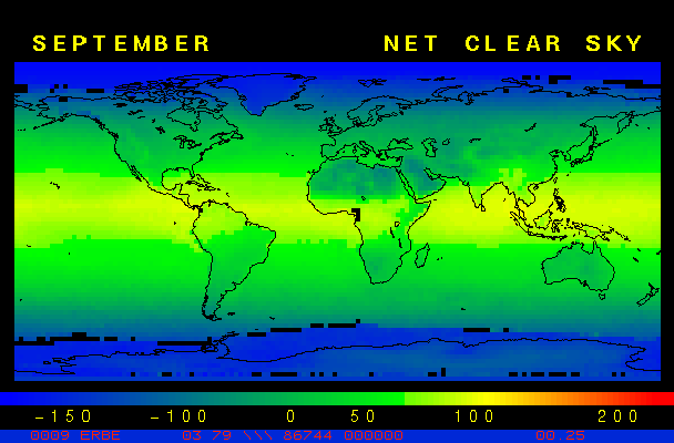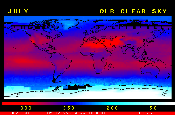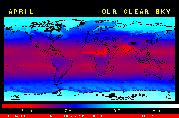 Clear-sky observationsBelow are the ERBE derived monthly mean clear-sky albedo, outgoing longwave radiation, and net radiation budgets. From these maps you can observe the effects of changing vegetation on the energy balance of the planet. Observations of cloud radiative forcing are given below.Loop of Monthly Mean Clear-sky Albedo Loop of Monthly Mean Clear-sky OLR Loop of Monthly Mean Clear-sky Net RadiationCloud radiative forcingThe solar and terrestrial properties of clouds have offsetting effects in terms of the energy balance of the planet. In the longwave, clouds generally reduce the radiation emission to space and thus result in a heating of the planet. While in the solar (or shortwave), clouds reduce the absorbed solar radiation, due to a generally higher albedo than the underlying surface, and thus result in a cooling of the planet. The latest results from ERBE indicate that in the global mean, clouds reduce the radiative heating of the planet. This cooling is a function of season and ranges from approximately -13 to -21 Wm-2. While these values may seem small, they should be compared with the 4 Wm-2 heating predicted by a doubling of atmospheric concentration of carbon dioxide. In terms of hemispheric averages, the longwave and shortwave cloud forcing tend to balance each other in the winter hemisphere. In the summer hemisphere, the negative shortwave cloud forcing dominates the positive longwave cloud forcing, and the clouds result in a cooling. View the maps of cloud forcing given below to answer the following questions: