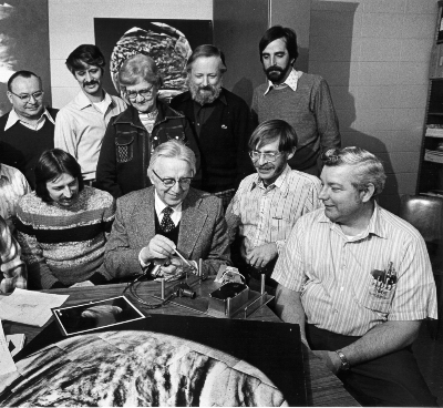 Below, SSEC's Pioneer Venus crew surrounds Professor Suomi and a model of the Net Flux Radiometer, which measured heat flux in Venus' atmosphere in 1978. Left to right: (back row) Gene Buchholtz, Bob Herbsleb, Wanda Lerum, Jerry Sitzman and Hank Revercomb; (front row) Ralph Dedecker, Verner Suomi, Larry Sromovsky and Bob Sutton. Not shown: Evan Richards, Doyle Ford and Tony Wendricks. |