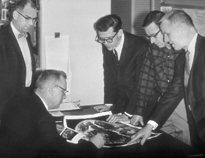 Professor Verner Suomi (seated, second from left) views early photos from the ATS (Applications Technology Satellite) with Professor Robert Parent (far left) and three University and NASA colleagues. |