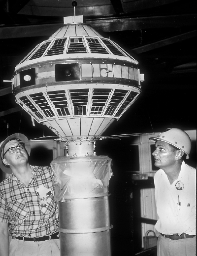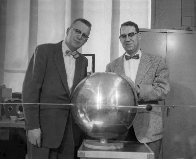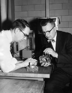 On the left, Professors Parent and Suomi build a 1960s satellite instrument.