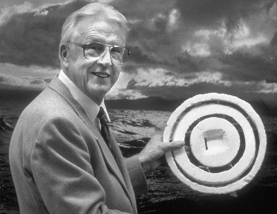 This is a 1994 photo of Professor Suomi holding the prototype instrument he invented and patented to measure the ocean - atmosphere heat flux. |