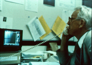 Above, during a telephone interview at the Jet Propulsion