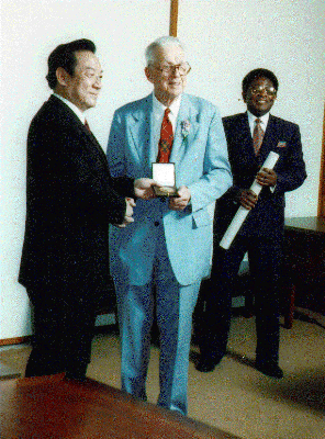Professor Suomi, center, receives the 38th annual IMO prize from WMO Present Zou Jingmeng (left) and WMO Secretary General, G.O.P Obasi | ![]() |