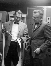 . | ![]() Professor Suomi (right) reviews satellite data with Prof. Robert Parent in the 1960s. At that time, the data were received on an analog data recording system. |