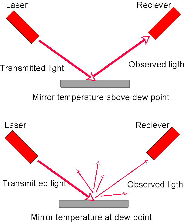 Figure 5.2 Scattered light from a beam is used to measure dew point temperatures. When dew forms, less light is received by the Receiver because the dew drops scatter light into all directions, just like clouds.